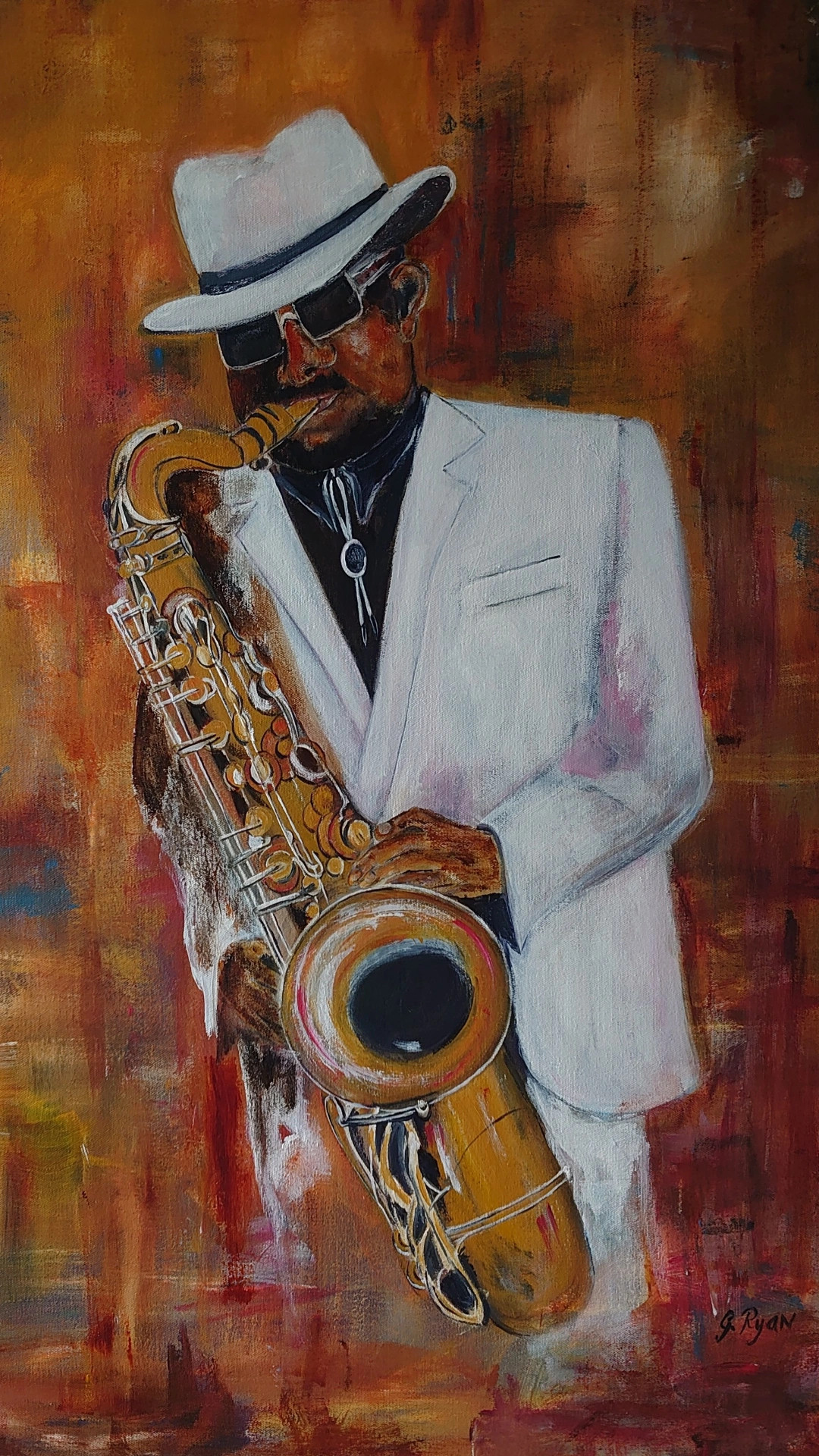 Title : The Saxophone Player Size : 25 " x 36"Medium : Acrylic on deep wooden base canvasStyle : Loose style painting in vibrant colours Delivery : Free Delivery in Ireland